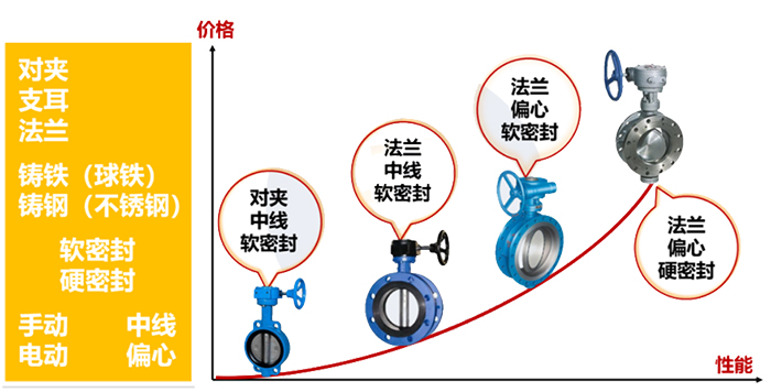 在性能和價(jià)格線圖中,我們可以看到閥門從對夾中線軟密封到法蘭偏心硬密封,在性能提高的同時(shí),價(jià)格也是大幅的上漲。所以平時(shí)我們在確定蝶閥形式時(shí),非必要工況應(yīng)當(dāng)最優(yōu)化選擇。