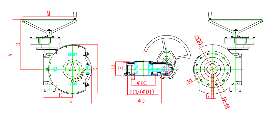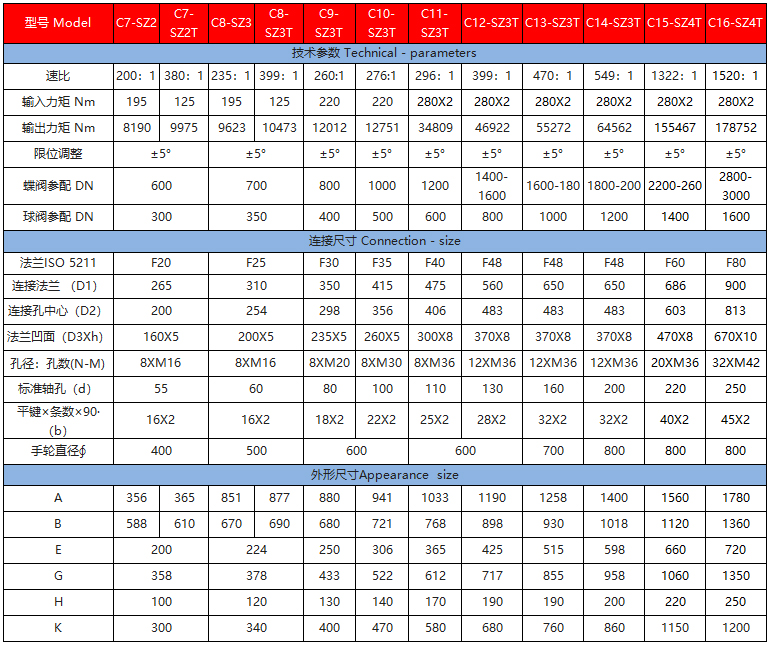 該系列是直齒輪箱與蝸輪箱對接組合成為二級傳動蝸輪減速增壓機構(gòu),提高了機械總效率,輸入小力矩,開動大閥門,使操作人員省力,每種型號提供多個傳動比,能更好的匹配不同規(guī)格的閥門。